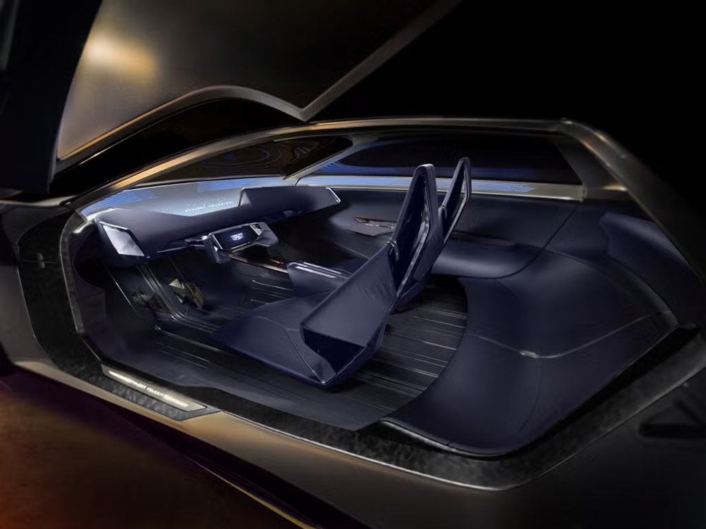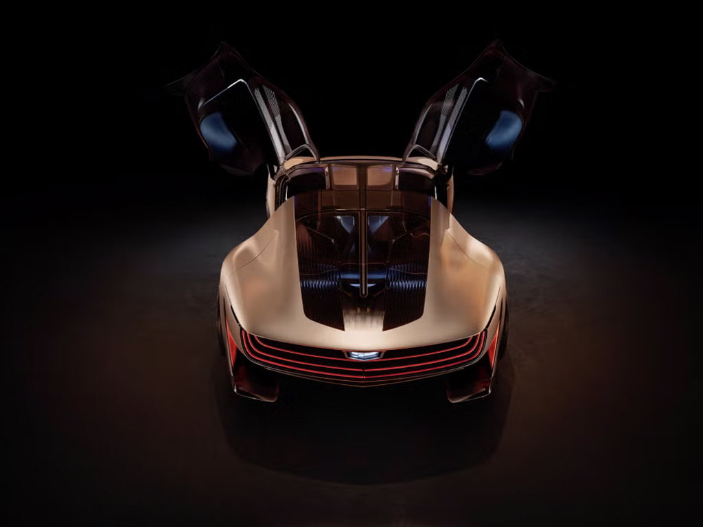The exterior of the Opulent Velocity is as striking as its performance capabilities. Drawing inspiration from Cadillac’s V-Series.R hybrid racecars, the concept boasts a low, aerodynamic silhouette that exudes speed and sophistication. The large butterfly doors, a signature feature of the concept, not only provide a grand entrance but also reflect the vehicle’s futuristic design ethos. Cadillac’s iconic vertical lighting, crystal fluted detailing, and illuminated badge further enhance the concept’s bold and luxurious appearance.