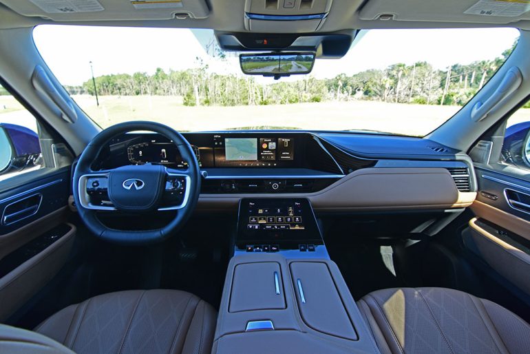 The seating areas in the second row, featuring heated and ventilated captain’s chairs, are power-adjustable and perform a quick power-moving function for easy access to the third row, which is surprisingly accommodating once you lift the rather large headrests. Speaking of headrests, Infiniti takes things up a level for the new Klipsch audio system featuring 28 speakers with ones integrated into the front headrests. The system sounds good but seems to need just a bit more power when playing complicated and layered songs. The headrest speakers are clever as the driver’s headrest speakers will be the only ones to fire sound for navigation or announcements from the new Google-based system. Such sound also includes navigation announcements from apps on your smartphone, which is allowed via wireless (or USB-connected) Apple CarPlay and Android Auto integration. A wireless charging pad is located under the left armrest door, which often gets in the way when it’s opened as the door protrudes out of the cubby area. There’s nicely placed LED ambient lighting throughout with special touches of the illuminated Infiniti lettering on the dash, accented LED lighting along the edges of the panoramic sunroof’s power shade, and clever exterior lighting elements such as a lighted Infiniti emblem.