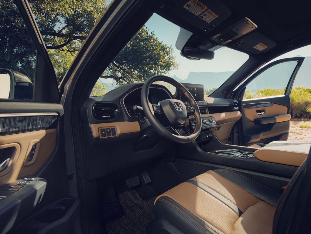 For those who crave more off-road capability, the TrailSport and TrailSport Elite trims add a rugged touch. Both feature a gloss black grille and trim, metallic silver skid garnishes, orange recovery hooks, and amber LED daytime running lights that give these models a distinctive, purposeful appearance. The TrailSport trims also come equipped with 18-inch General Grabber all-terrain tires, which Honda co-developed with General Tire for optimal off-road performance.
