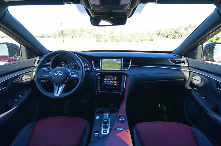 The CVT attempts to emulate a traditional automatic transmission, particularly at lower speeds or under full throttle, but it struggles with consistency. Power delivery is inconsistent, and the throttle feels sluggish initially. After passing 15 mph or so the QX55 surges in a way that feels disconnected from the driver’s intention. This lack of smoothness takes away from what could have been an enjoyable ride, especially given the engine’s respected capability and decent power output for a compact crossover.