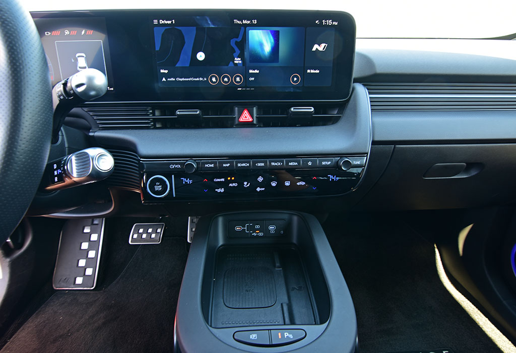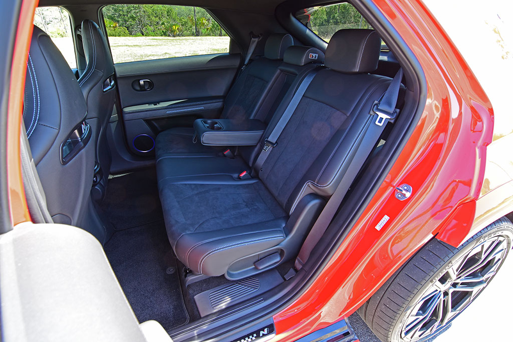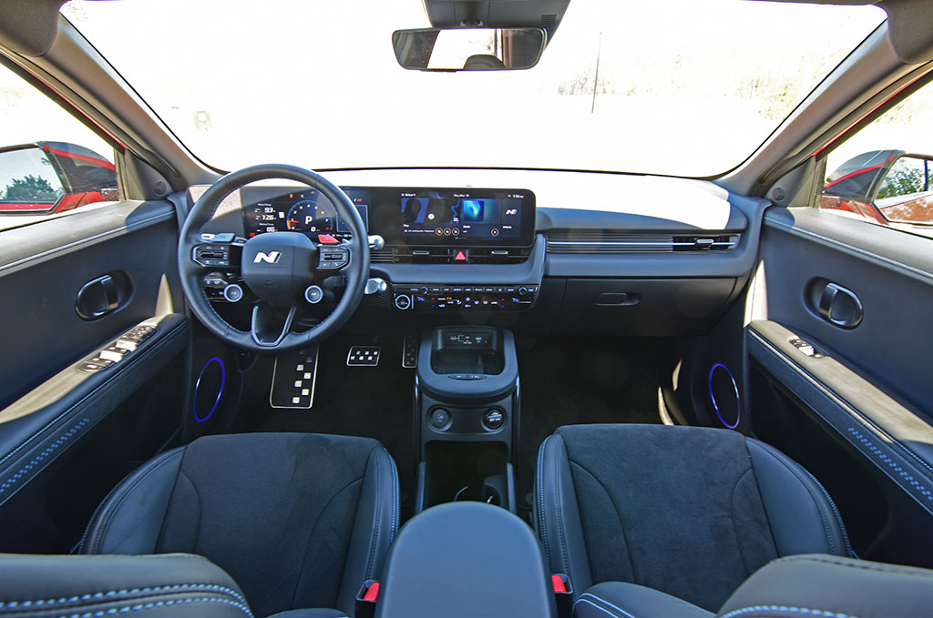 Stepping inside the Hyundai Ioniq 5 N takes you to an inviting space where there’s much more room than you anticipate. The Ioniq 5 N is technically classified as an SUV despite its VW Golf/GTI-ish hatchback look. The interior space mostly matches that classification with a spacious cabin that has a unique play on its sportiness through its bucket seats. The heated and ventilated front seats are very supportive and proved to be surprisingly comfy even on long trips despite their aggressive bolstering.