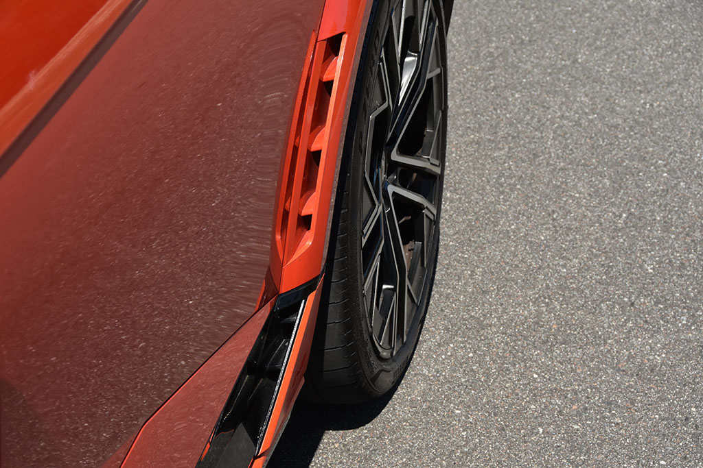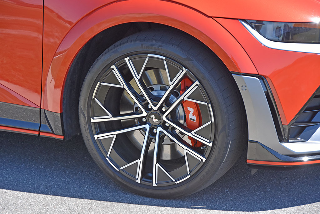 There are a lot of other performance aspects to appreciate in the Hyundai Ioniq 5 N that depart from any other version of the new Ioniq 5, starting with the large floating brake rotors that have fixed 4-piston calipers up front and single pistons in the rear. You also get the proper looks and functional aero from wheel well vents and a large rear defuser to the large 21-inch forged wheels wrapped with Pirelli P Zero PZ4 Elect summer performance rubber at all four corners and its top-of-the-hatch spoiler with a unique center triangle brake light.