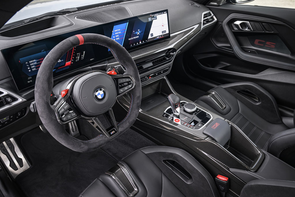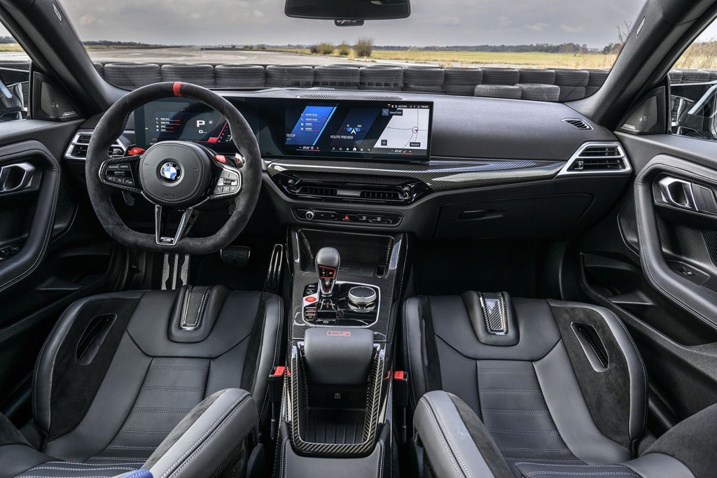 What really sets the M2 CS apart, though, is how BMW has gone about trimming the fat. Compared to the standard M2, the CS drops 97 pounds thanks to the liberal use of carbon fiber throughout the body, including the hood, roof, and that distinctive ducktail rear spoiler. The car also comes standard with lightweight forged wheels and carbon-backed bucket seats, adding to its no-nonsense performance vibe. All in, the M2 CS tips the scales at 3,770 pounds—lighter than even the manual-equipped base model.