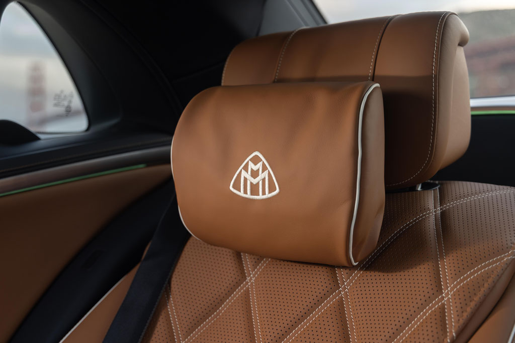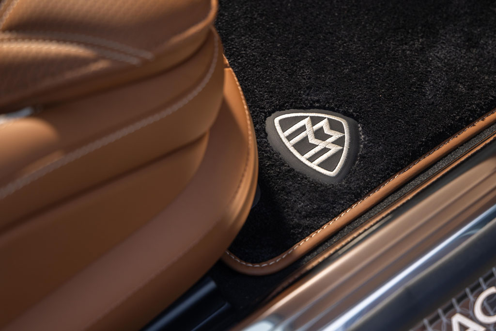 Inside, the cabin is a showcase of hand-crafted artistry. Edition-specific MANUFAKTUR Exclusive Light Brown Nappa leather is stitched by hand and covers the seats, dashboard, consoles, and door panels. The same supple leather is used for the steering wheel, comfort pillows, and folding tables in the rear. A MANUFAKTUR Black Nappa leather headliner with a diamond-quilted pattern adds to the sense of elegance, while Black Piano Lacquer Flowing Lines trim and silver chrome accents offer a tasteful contrast. Special touches include an “Edition Emerald Isle 1 of 25” badge with a Maybach floral motif, illuminated door sills, and high-pile mats edged in Light Brown Nappa leather with embroidered Maybach logos.