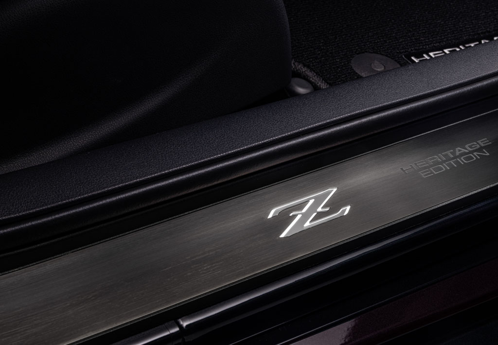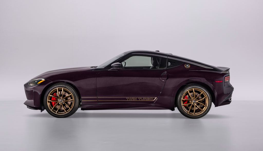 The 1990s influence is clear the moment you clock the details. Bronze 19 inch RAYS wheels sit perfectly in the arches. A carbon fiber rear spoiler wears a retro style Twin Turbo badge. Matching bronze graphics stretch down the body sides like a throwback poster. Open the door and you get model specific kick plates and floor mats that round out the look. Then there is the paint. Midnight Purple returns as the star, a tone that has been etched in Nissan performance history and looks right at home on the modern Z’s lines.