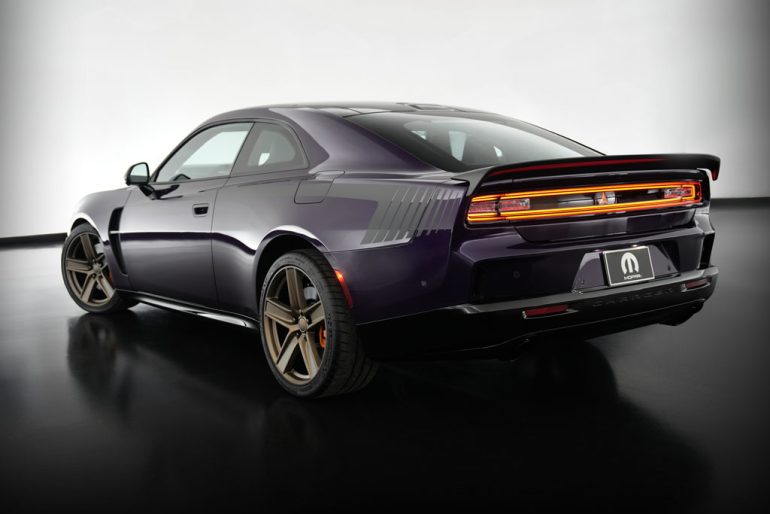 Across the aisle, the Moparized Dodge SIXPACK Charger brings a different flavor of menace. Draped in Stryker Purple with satin carbon fiber on the hood, splitter, and rear deck spoiler, it matches show car gloss with real aero and weight savings. Concept vented fenders relieve pressure in the wheel wells, while a Mopar performance spring kit drops ride height one inch for a lower center of gravity and sharper response. Five spoke 21 by 11 inch Brass Monkey wheels frame orange Brembo calipers, and under the hood lives the 550 horsepower 3.0 liter Twin Turbo SIXPACK HO backed by a Mopar cold air intake and stainless cat back exhaust. The cabin gets the couture treatment with Katzkin leather in Tuscany Ink and Palomino, accented by orange and purple stitching, plus Mopar pedal covers and protective mats to keep the nasty out.