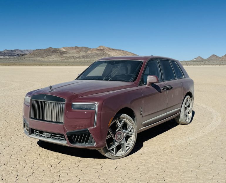 To explore the expansive, barren land, my drive partner Ken Panton and I selected a Black Badge Cullinan Series II, beautifully themed with a Morganite-painted exterior, unique Black Badge coachwork, and a gorgeous Black and Grace White interior. Power from the 6.75L V12 Twin-Turbocharged engine increased to 600-horsepower and 664 lb-ft of torque. The Cullinan features Rolls-Royce AWD and 4-wheel steering to help maneuver the stately SUV and its upgraded Black Badge 23-inch wheels efficiently. Yet, when I discovered the “OFF-ROAD + DSC OFF” mode, it was time to put the big-body in a spin cycle and ceremoniously create land typhoons while drifting through the smokescreen. Afterwards, I could only think about how Rolls-Royce was going to have these bad boys detailed.