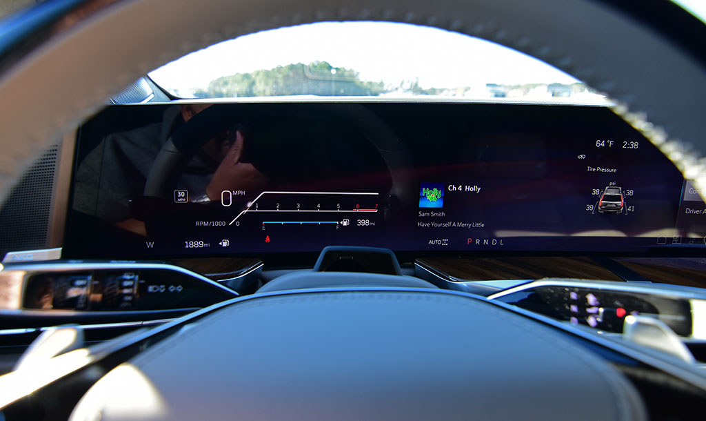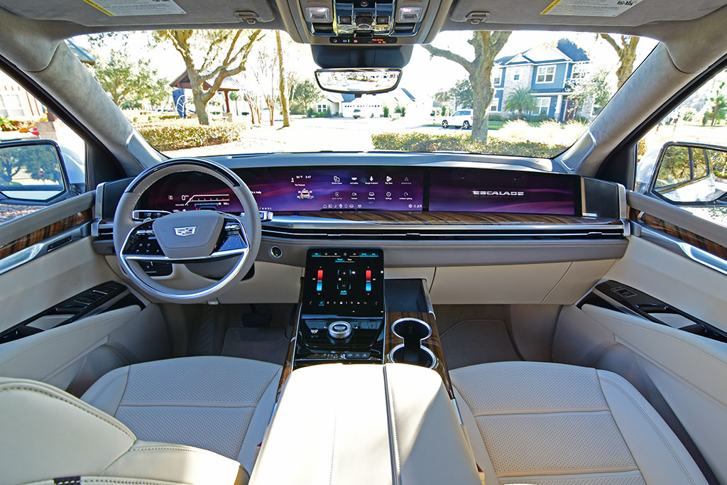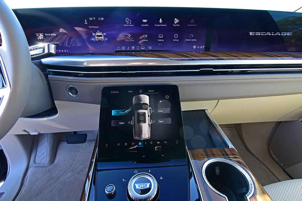 The interior space, much of what is expected out of a large luxury SUV, has a plush theme that’s accentuated by high-quality materials throughout, with the one exception being the lower door trim still consisting of hard plastics. Otherwise, the new Escalade has an inviting and tech-forward cabin that’s flanked by its attention-grabbing 55-inch screen that nearly spans the width of the vehicle. Cadillac did the screen justice for its layout and functionality, where the steering wheel is still placed in a traditional position, overlaying the screen, where information is cleverly displayed to see through the top portion of the heated and power-adjustable steering wheel. While the center part of the infotainment screen can be a far reach for some, there’s a welcomed redundancy of controls through the central wheel at the center console, along with a separate waterfall touchscreen to interact with commonly used functions and access to a plethora of other vehicle features, including the power-opening/closing doors.