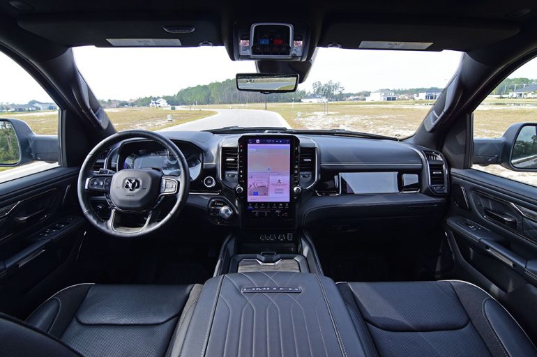 The interior of the Ram 1500 Limited 4×4 is a plush space that has many forward-thinking innovations, starting with its configurable center console that has dual wireless smartphone charging pads. From there, things ramp up with the multitude of screens from the driver’s digital gauge cluster to the largest-in-its-class portrait-style 14.5-inch infotainment touchscreen and the 10.3-inch passenger touchscreen display. Ram keeps with the luxury truck theme in the Limited trim with massaging, heating, and ventilated front seats that prove to be rather comfy on long trips. The rear outboard seats also have heating and ventilation. There’s proper leather stitching throughout, and a limited amount of open-pore wood trim.