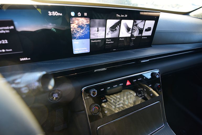 As far as interacting with the Genesis GV80, the controls are well placed, and there’s just a short learning curve to become accustomed to the haptic touch button areas for the climate control system that has two selectable and flow-adjustable fragrances to choose from, so your GV80 not only looks good but smells good, too. However, there’s a set of physical knobs for the volume, station toggle, and both front automatic climate zones. Moreover, almost similar to BMW’s iDrive controller, there’s a central glass knob for controlling the infotainment system, giving you a redundancy of controls if you choose not to reach and touch the screen. Lastly, the wireless Apple CarPlay and Android Auto integration becomes immersive with the ability to display a mapping app like Waze or Google Maps into the gauge cluster display, which has some interactive graphic displays that change with the time of day. Genesis is almost showing off at this point, and I like it.