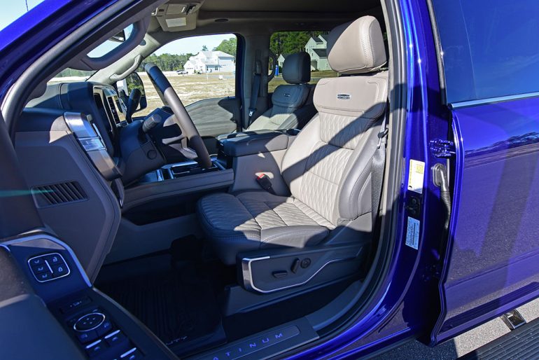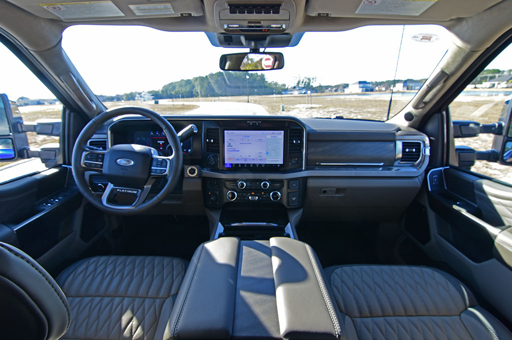As usual, the cabin is vast, and the seating areas are huge, but those with smaller frames can find a proper position so as not to be overly intimidated by piloting or riding in the F-250 Super Duty. You still have plenty of adjustability in the power seats, power steering column, and even the power-adjustable pedals, which can all be saved to one of three memory seat settings. You’ll still have to make several turns lock-to-lock on the large steering wheel, but the hydraulic-powered steering rack has the right amount of feel for such a vehicle.