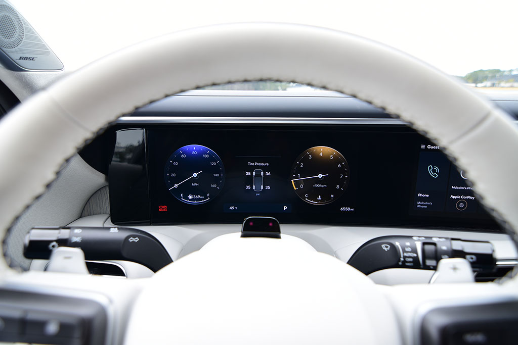 The cabin is quiet and subdued, rivaling many luxury SUVs. There’s plenty of quality materials mixed in with soft-touch surfaces throughout and adorned with art deco-inspired wood trim that gets splashed with color-selectable ambient lighting in some areas. The latest 12.3-inch digital gauge cluster displays plentiful information but still lacks the ability to view mapping. The center 12.3-inch touchscreen replicates what you find throughout the brand for its well-to-do infotainment system that’s rather simple in its use, with a short learning curve.