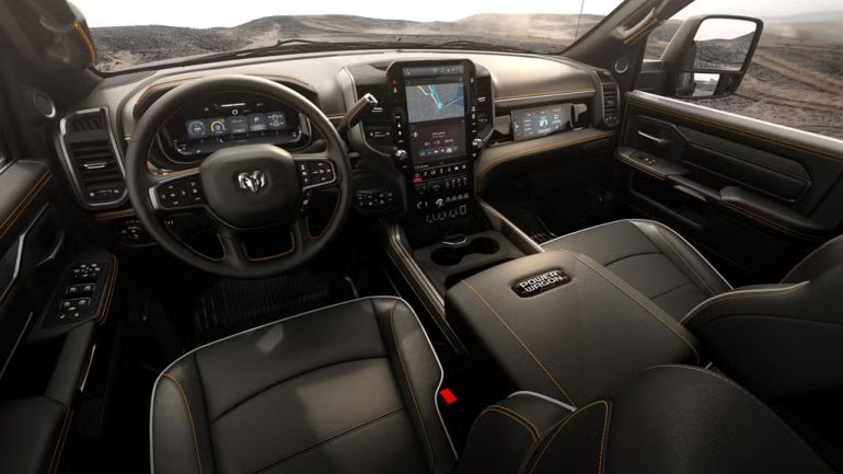 Inside, Ram goes surprisingly upscale with high-end leather upholstery and Copperhead Orange contrast stitching across the dash, doors, seats, shifter, and steering wheel to break up the dark cabin. There’s also a unique center-console badge with either Power Wagon or Rebel branding, and a lockable safe tucked inside the console for stashing valuables. It’s the kind of interior detailing that feels more limited-run luxury truck than simple appearance package.