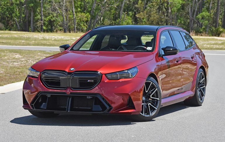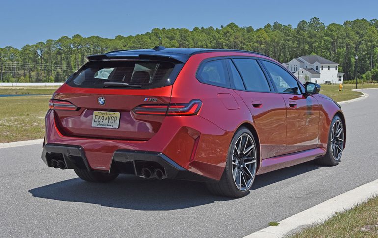 The 20-inch wheels and tires up front and 21-inchers out back with a wide 295 section do the job to grapple the pavement in a way that the M5 Touring feels somewhat light on its feet until you actually commit to a sharp corner. Yes, the hefty weight is often hidden, but it can quickly be found when you push the M5 into long corners and bends. The suspension with its adaptive dampers attempts to pull off a magical act and does so for those quick steering inputs, but tends to feel lumpy and busy when you’re trying to drive civilly. Here, I rather hate how the M5 Touring (and M5 Sedan) has an overly busy ride quality that’s mostly lofty in the rear when going over road undulations and rises. There’s even so much suspension travel out back that rear passengers feel they are nearly ejected from their seats when going over a moderate road rise or dip. Not cool, BMW!