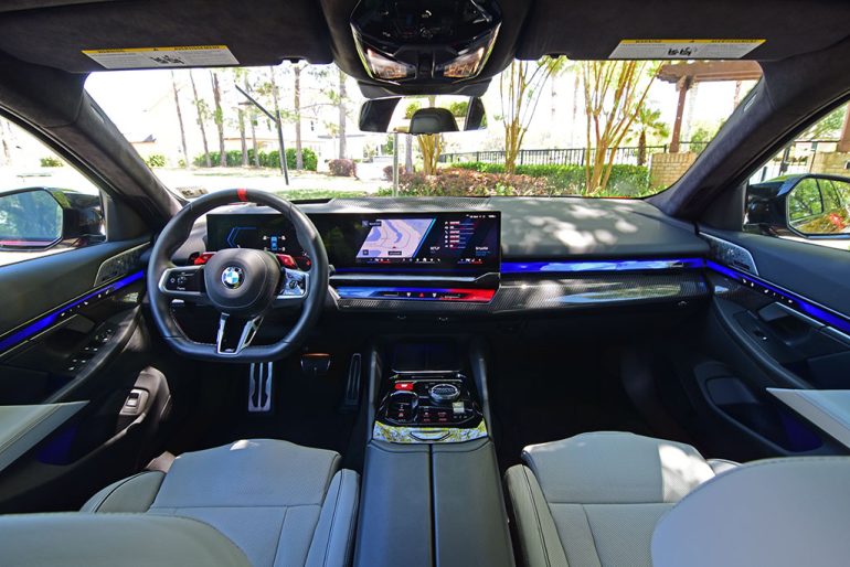 Most of the full-on BMW M5 experience is in its plug-in hybrid (PHEV) powertrain setup, where the hybrid bits are more performance adders than efficiency-seeking parts. Don’t expect to go far outside of the 13 mpg combined EPA estimate here when you are having a little fun in the many Dynamic and Sport-like drive modes. With that in mind, the BMW M5 and M5 Touring are going to have you visit the gas station often to fill the somewhat smallish 15.9-gallon tank full of premium unleaded. However, between those fills, you have the added advantage of charging up the M5 Touring to serve up 27 miles (I was able to get 30 miles of all-electric range) of electric-only range utilizing the electric motor’s output of 194 horsepower and 207 lb-ft of torque. Oddly enough, that electric motor power is just enough to move the M5 Touring along without worry of your safety as it cleverly shifts through the gears of the 8-speed automatic transmission to maximize the output of the electric motor.