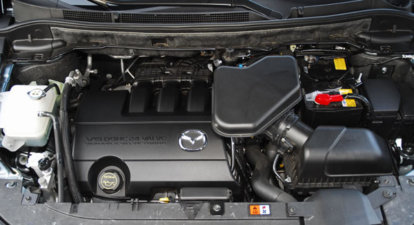 The 2010 CX-9 is powered by a 3.7 liter DOHC V6 engine making the most complex pursuits as easy and pleasurable as possible. The 60-degree short-stroke V6 is state-of-the-art throughout. Advanced features include a die-cast aluminum block with cast-in iron cylinder liners and aluminum cylinder heads for minimal weight. The valvetrain includes chain-driven dual overhead camshafts for minimal maintenance, four valves-per cylinder with direct acting bucket-type actuators, and variable intake valve timing. A high 10.3:1 compression ratio maximizes efficiency and power output while the throttle is electronically controlled for instantaneous response. Computer-aided-engineering analysis was extensively used to configure the cylinder block casting, to shape intake and exhaust ports, and to design the high-volume exhaust system fitted with three large mufflers. Very low back pressure is one of the reasons why the power curve is still ascending at the 6,500rpm redline. Engineering details even extend to a roller-chain- cam-drive sprocket lined with rubber for quiet operation. A power peak of 173hp at 6,250rpm provides the CX-9 with excellent acceleration and passing performance. The torque curve keeps 250lb.ft. from 3,000 to 6,000rpm and peaking at 270lb.ft. at 4,250rpm.