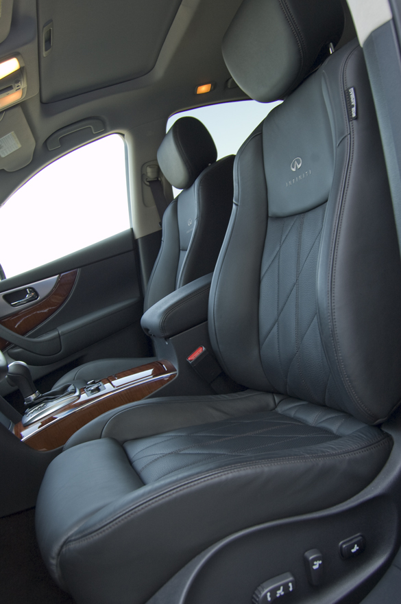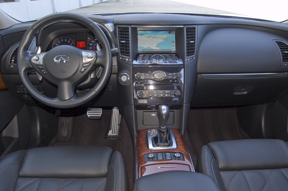 Besides the FX’s aggressive looks you can comfortably seat 5 adults. The two front passengers can enjoy the climate controlled and bolstered seats. Headroom is not a major issue up front but could be in the rear, as the sweeping roof starts close in. Cargo room is slightly less than other competitors but I really do not think many FX buyers will be too concerned about that in the luxury crossover segment. The hunkered-down silhouette really adds a sex appeal to the FX although you will give up some interior cargo area for the ‘looks’.