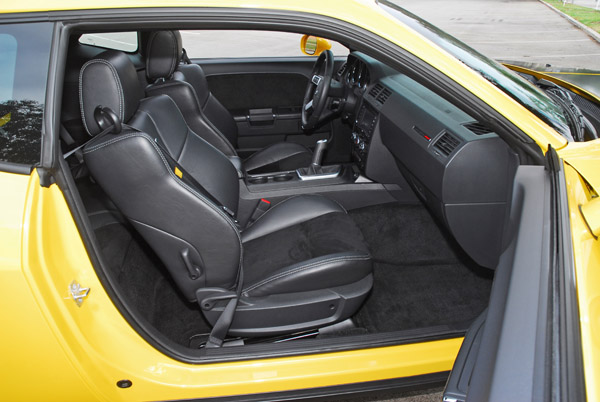 New for the 2010 Dodge Challenger STR8 is a limited-edition Plum Crazy model. It features a unique Plum Crazy Pearl Coast exterior paint color with a plum seat-stripe insert along with a serialized dash plaque. My test Challenger SRT8 was painted ‘Detonator Yellow’ clear coat, which was available late in the 2009 model year, and features a yellow seat-stripe insert on the seatbacks.