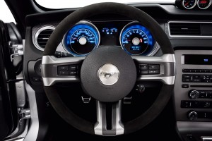 2012 Ford Mustang Boss 302: 2012 Mustang Boss 302 interior showing standard Alcantara-covered steering wheel and IP treatment. (08/13/2010)