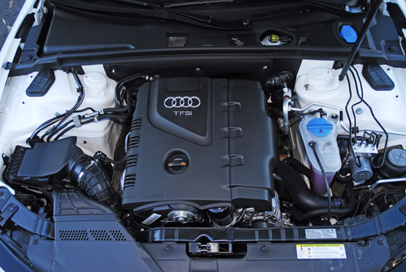 This time I wanted to step down to a less powerful engine, the basic 2.0 liter turbocharged direct injected inline 4-cylinder engine to get a perspective on the powerplant that most Audi consumers opt for. Although rated at lower 211hp at 2,500-6,000rpm but with a torque rating of 258lb.ft. at just 1,500-4,200rpm, this potent engine still was able to solidly plant my back into my seat when I pushed the throttle to the metal at launch. With 90% of the torque available at just 1,500rpm from the turbo, it pushed the car to 60mph from a standstill in a scant over 7-seconds. The engine features a cast iron block, aluminum heads, Audi valvelift system on exhaust valves, DOHC’s, precision FSI direct fuel injection, and a exhaust turbo with an intercooler that you can see through the bottom of the front air-intake. It revs high quickly and is very smooth and quiet from the inside.