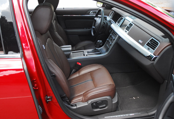 Standard features inside and outside the new MKS EcoBoost, not mentioned above, include adaptive HID headlamps, foglamps, heated power remote sideview mirrors, easy fuel Capless fuel filler, sporty, leather-wrapped, tilt-telescoping steering wheel with cruise-control, audio and Bluetooth buttons, two-driver memory for seats/sideview mirrors, steering wheel, leather/chrome stick shifter, dual-zone electronic auto climate control, push button start/stop, ambient lighting, all express power windows/door locks, self-dimming reaview mirror, dual lighted vanity mirrors, a center console with dual cupholders, deep storage bin and sliding leather padded armrests, easy-to-see, chrome ringed instrument cluster, all dials, switches and levers within easy reach and fully illuminated, dual panel electric sunroof, storage slots in the doors, map pockets behind the front seats, reading lamps in the rear, pull-down center armrest and dual cupholders in the rear, a rear pass-thru for longer storage items, remote trunk release, thick cut-pile carpeting and front/rear floor mats.