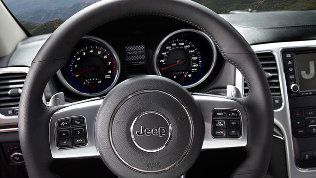 The 2012 Jeep Grand Cherokee’s refined, luxurious interior takes on a performance feel in SRT8 form with race-inspired technology and SRT-exclusive appointments.An all-new, leather-wrapped, heated steering wheel features a unique rim section with a flattened bottom surface – evoking a race-inspired cockpit – that showcases the SRT logo. Standard paddle-shift controls flank both sides of the new contoured palm rests while all audio and Electronic Vehicle Information Center (EVIC) controls are accessible from the horizontal spokes on the steering wheel. A power tilt and telescoping steering column also is standard.