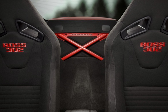 2012 Ford Mustang Boss Laguna Seca eliminates the rear seats, instead adding a cross-car X-brace that couples the structure between the rear wheels. The brace offers chassis stiffness improvements of as much as 10 percent and allows the suspension tuning – precisely calibrated by Mustang team members – to better do its job. (2/22/2011)