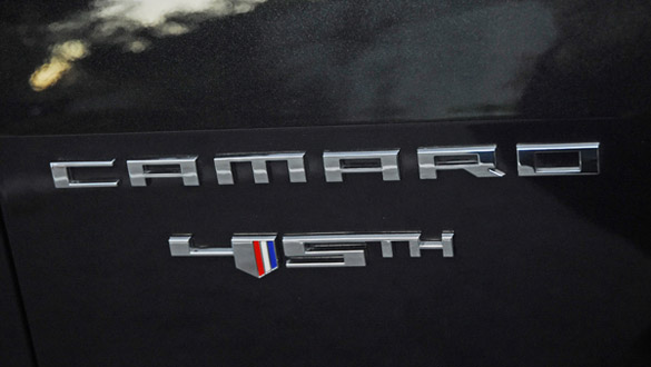 Chevrolet celebrates 45 years of Camaro production with this very special, limited-production 2012 45th Anniversary model.  It’s a ‘black tie’ celebration because each anniversary model is custom painted ‘Carbon Flash Metallic’ (black with hints of dark green), and includes a unique rally stripe in red and silver with 45th Anniversary graphics on the stripes.  Also included are special fender emblems celebrating the 45 years of production, a new 20X8 and 20X9 inch wheel design in deep silver, RS-style taillamp lenses, a standard rear spoiler, standard HID headlamps, body-color roof molding, leather-trimmed front bucket seats with the Anniversary Logo embroidered on the seatbacks, a white instrument panel with the 45th Anniversary logo on the right side, white door trim inserts with green glowing LED ambient piping at night, red, white and blue stitching on the seats, and the Anniversary logo on the bottom of the leather-wrapped/tilt/telescoping steering wheel and sill plates.  Chevy wants all who gaze at this beautiful sports coupe to know that it celebrates 45 years of Camaro production.