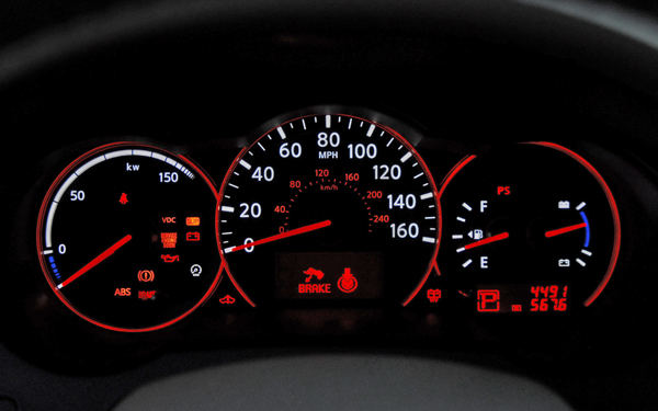A digital display on the speedometer indicates when the Altima hybrid is running solely on electric power. The car’s optional DVD navigation system also features a ‘real-time’ display