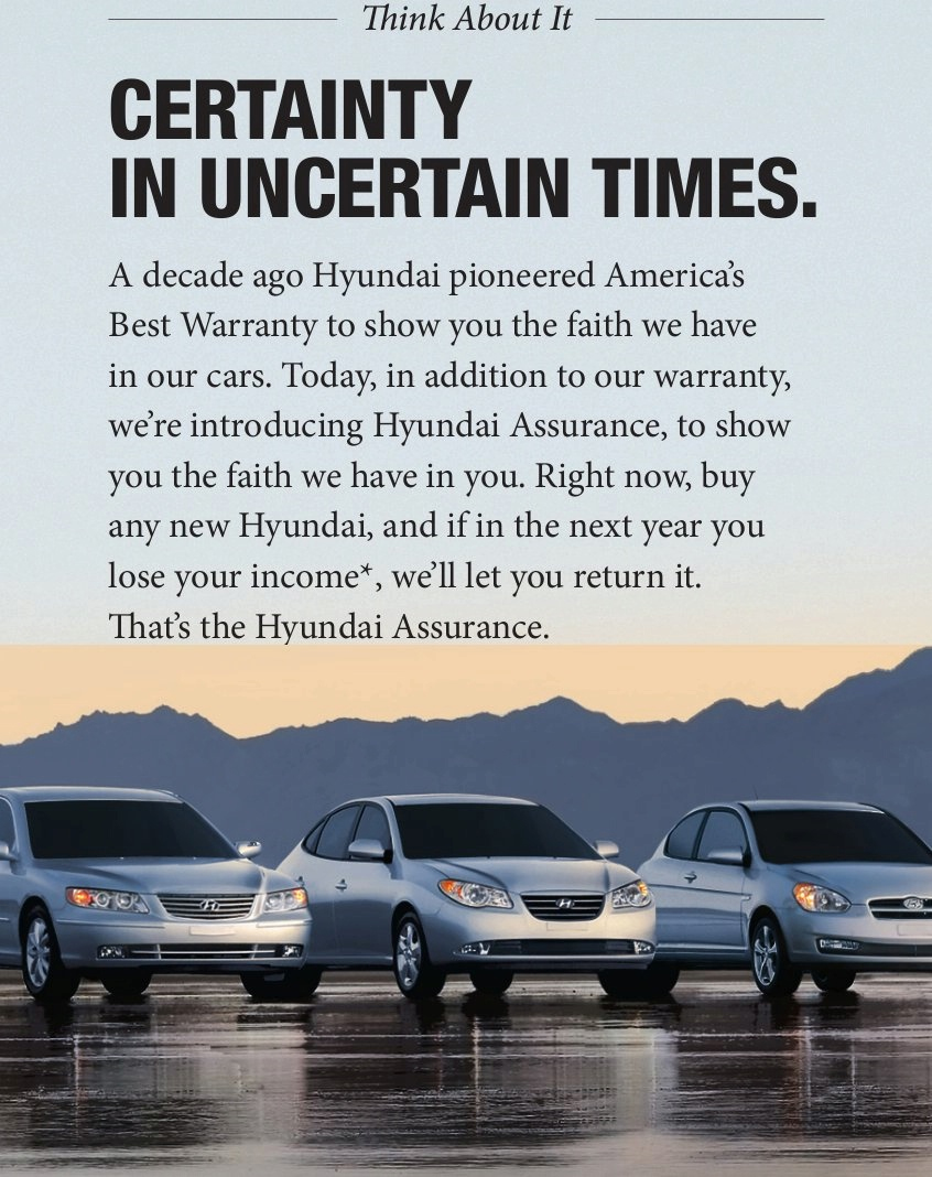 During our slumping economy plans or incentives such as these gain a lot of traction and makes people really consider purchasing a brand that offers such a program. Let’s face it, it is a very real reality that you have to foot your car notes after lose of a job because 9 times out of 10, you will need that vehicle to help you search for a new job. Hyundai has you covered. But you must act now if you wish to purchase a new Hyundai and take advantage of this program. The Hyundai Assurance Plus incentive will be offered from February 23rd to April 30th.