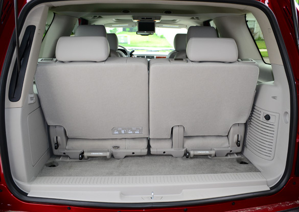The 2nd row seating configuration in my Tahoe LTZ test vehicle only included two bucket seats while the 3rd row was a 50/50 split removable bench. One downfall of the Tahoe, especially when compared to other large SUVs, is that the 3rd row does not fold flat into the floor. Cargo space is considerably cut down due to the folding 3rd row bench unless you remove it completely. Removal of the rear bench can easily become a two-person objective, too. The Tahoe can be had in 7, 8 or a full 9-passenger configuration. To seat 9, the Tahoe uses a 40/20/40 front bench.