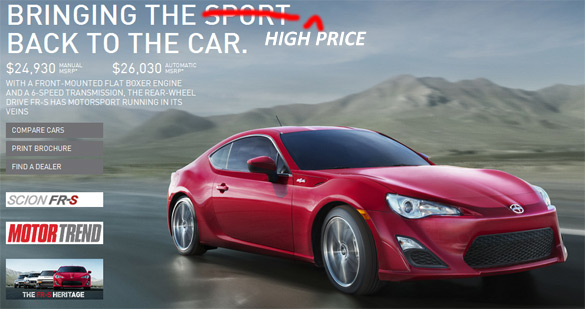 The new 2013 Scion FR-S is sure to be a big hit among enthusiasts looking for an affordable rear-wheel-drive sports coupe. Unfortunately, those looking to pay around the $25K MSRP price may be out of luck due to Toyota/Scion dealerships tagging a hefty Market Value Markup of almost $7,000.