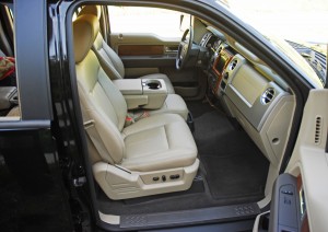 New for 2009 is the Platinum series, the most luxurious F-150 ever. The striking Platinum features a satin chrome grille with fine mesh inserts, 10-way captain’s chairs upholstered with top-quality leather, tuxedo stitching and embroidered logos on the seatbacks, satin gloss Lacrosse Ash wood grain accents and real brushed aluminum panels that gives the dash, center console and doors an upscale look and feel like no other full-size pickup. Standard 20in., 16-spoke polished aluminum wheels further give it a commanding presence on the road.