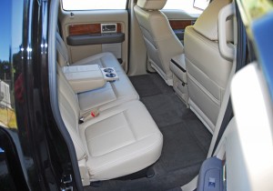 The interior of the new F-150 SuperCrew offers more usable space for moving more people and gear thanks to a 6in. stretch that improves rear seat legroom and cargo capacity. A mechanically articulated second-row seat flips up and out of the way. Combined with a truly flat floor, the feature gives the new SuperCrew class-leading 57.6cu.ft. of space behind the front seats and can accommodate items up to 47.9in. tall.