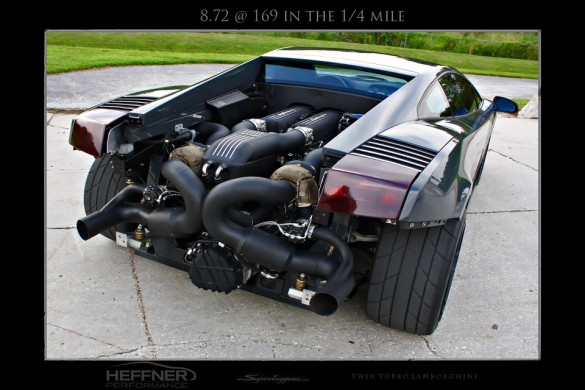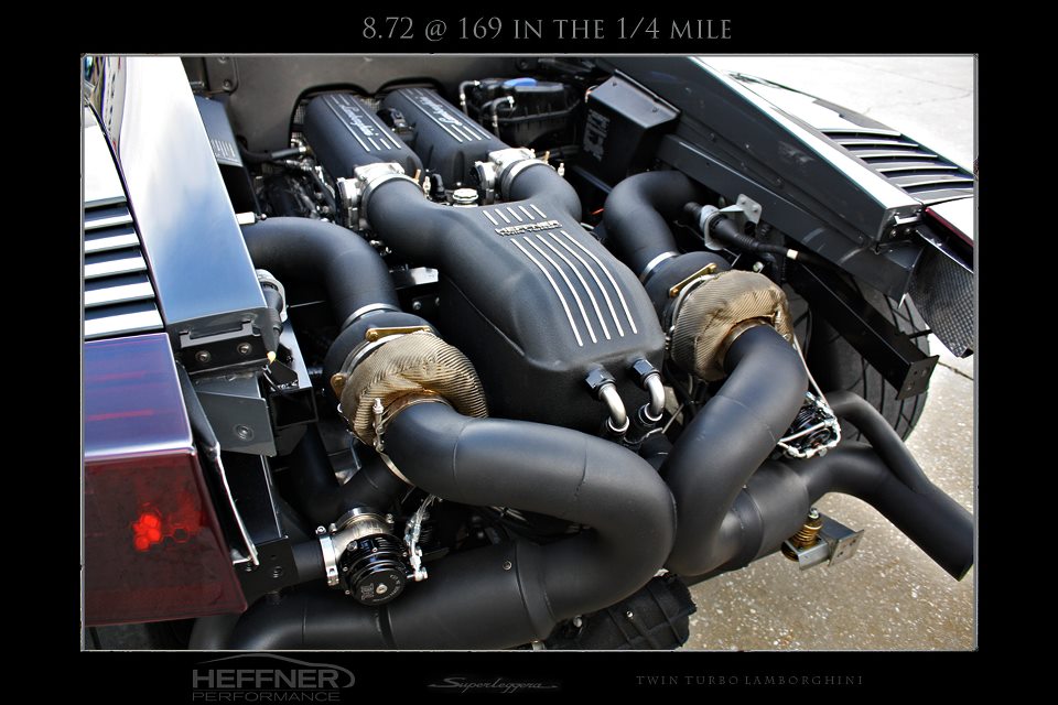 The build for the first Twin-Turbo Gallardo to hit 8 seconds in the quarter mile has been successful so far recently concluding with the best pass out of 8 recorded at 8.72 seconds at 169.8 mph. To our surprise, the owner and Jason’s crew all agree that there is yet even more to be had out of this monstrous twin-turbo bull. They plan on pushing the envelope even further. Be sure to visit Heffnersperformance.com for the latest happenings and build projects to come out of this one-of-a-kind shop.