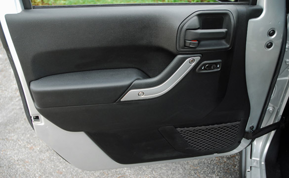 Passengers are now greeted by new front and rear seats. Re-contoured and with larger side bolsters, these seats are comfortable for long drives while offering more support for sporting off-road activities. Interior courtesy lighting is now found under the instrument panel as well as the cupholder areas for front and rear passengers. An auto-dimming electro-chromatic mirror is standard on all models and will feature LED map lights for front passengers. The optional premium tire pressure monitoring system can give direct read-outs for each individual tire. The Rubicon receives a new optional wheel design-an aggressive 17 in. 10-hole alloy wheel with polished accents and a mid-gloss gray painted inner face. My new Wrangler Rubicon came equipped with the beefy B.F. Goodrich LT255/75R17 in. T/A Mud Terrain Baja Champion tires with 3-ply sidewalls for extra strength off-road.