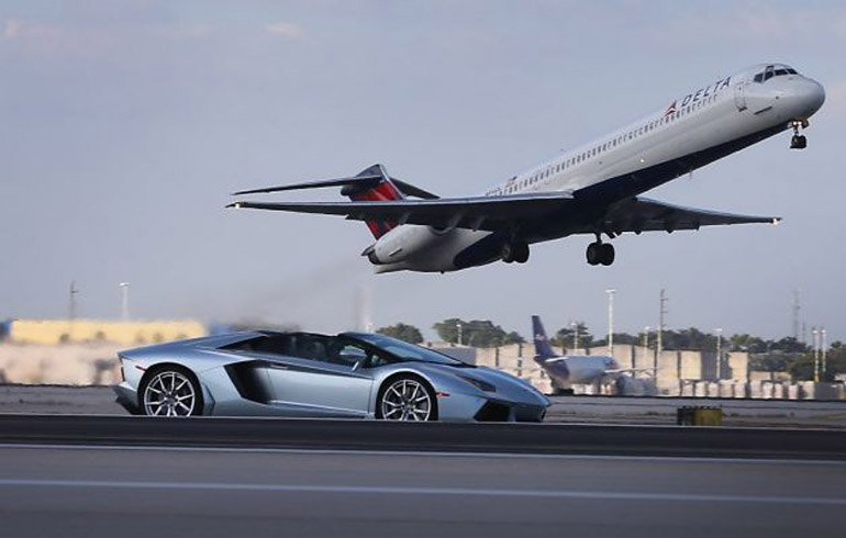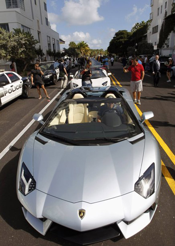 Lamborghini kicked off their 50th Anniversary celebration in Miami yesterday with a 40-car parade down the streets of Miami and Miami Beach then later concluding at the Miami International Airport for an exotic runway drive of about 12 new Aventador LP700-4 Roadsters. President and CEO of Lamborghini, Stephan Winkelmann, along with Miami Beach Commissioner, Jerry Libbin, joined in the festivities. Aventador Roadsters raced down a closed runway at speeds over 180 mph, a record for Miami International Airport during the festivities.