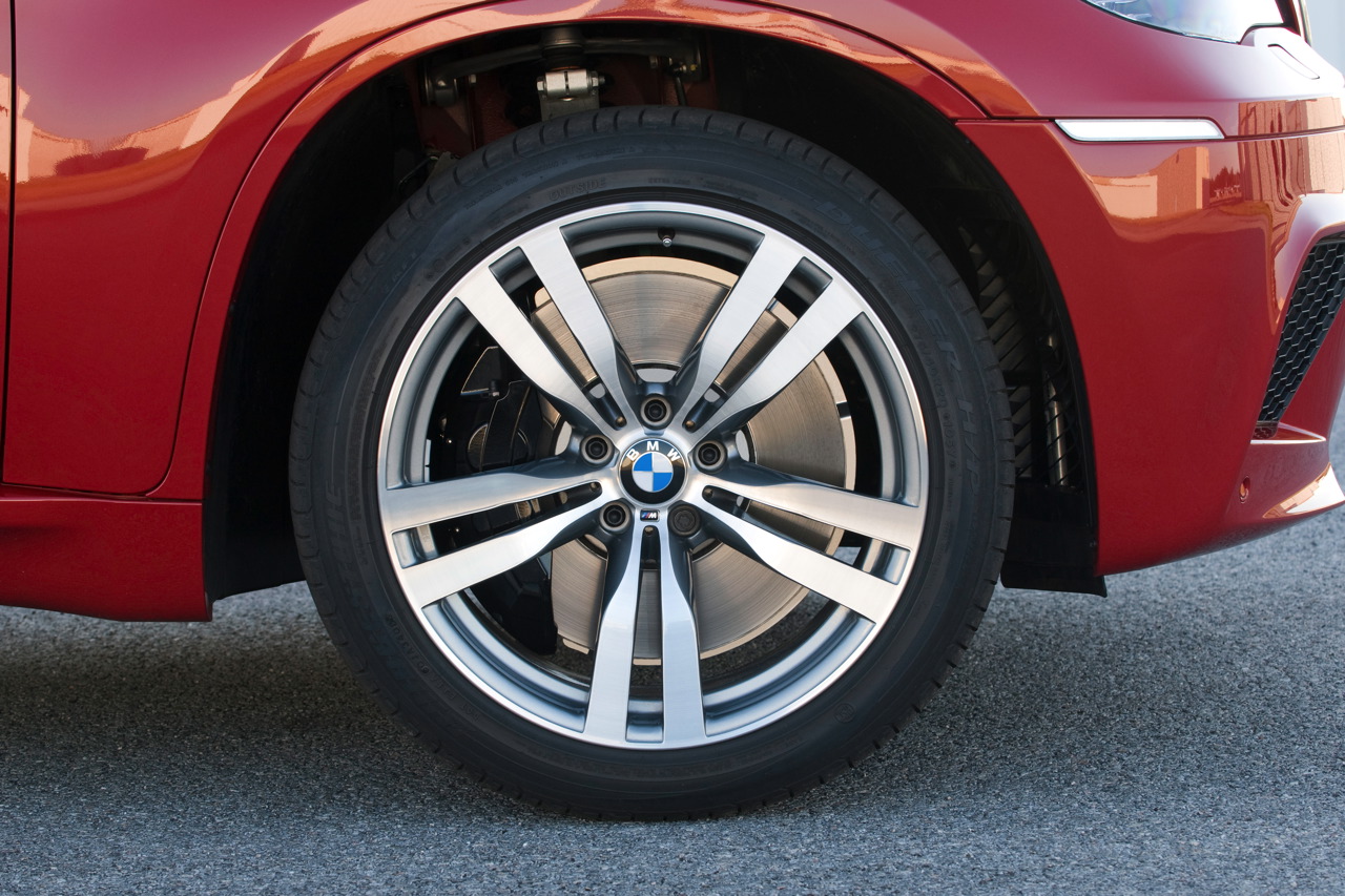 Outstanding stopping power with fade reduced to a minimum is guaranteed by the high-performance M brake system, which combines giant four-piston fixed calipers at the front with floating calipers at the rear, combined in each case with large, internally-vented lightweight brake discs. The brake rotors themselves measure 15.6” in diameter at front and 15.2” at rear. They feature a riveted connection to join the aluminum rotor hats with the cast-iron rotor discs.The BMW X5 M and the BMW X6 M are the only vehicles of their type equipped with staggered-size tires front and rear, running on 20-inch light-alloy wheels. The choice of runflat tires in sizes 275/40 R 20 at the front and 315/35 R 20 at the rear is a result of the special setup of both models, with the emphasis on rear-wheel power and dynamic handling balance. This promotes exceptionally good transmission of power to the rear axle and precise, razor-sharp steering behavior of both models. Transitional stability is also world-class.