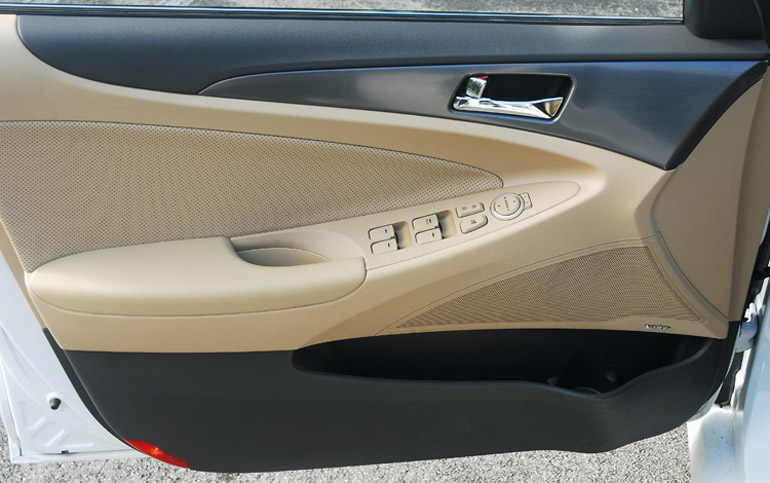 Standard equipment in my Limited Sonata Hybrid includes projector beam headlights with LED accents, LED taillights, front foglamps, power remote sideview mirrors with turn signal indicators, unique, tinted chrome front grille, bodyside molding tinted chrome inserts, chrome exterior door handles, proximity entry with push-button start/stop, remote keyless entry, alarm and immobilizer, active front head restraints, 5-3-point seatbelts with front pretensioners/load limiters, electric stability control with traction control, front, front seat side and curtain airbags, electroluminescent instrument cluster, 4.2 inch color TFT multi-function trip computer with hybrid technology display, dual automatic temperature control, front console mounted rear air-vents, heated front seats, chrome interior door handles, leatherette interior door panel inserts, leather trimmed front bucket seats with driver’s-side 8-way power adjustments, tilt-telescopic leather wrapped steering wheel with audio, cruise and phone controls, metal-grain interior accents, 499-watt AM-FM-Sirius XM/CD/MP3 with iPod/USB/auxiliary jack Infinity Premium audio system, power windows with driver’s-side express up/down, automatic door locks, integrated Bluetooth with phonebook transfer, Hyundai Blue Link Telematics system, auto light control, Virtual Engine Sound System, solar control glass, leather shift knob, navigation system with high-resolution touch screen display, rear backup camera, auto-dimming rearview mirror/homelink/compass, premium door sill plates, panoramic sunroof with power sunshade.