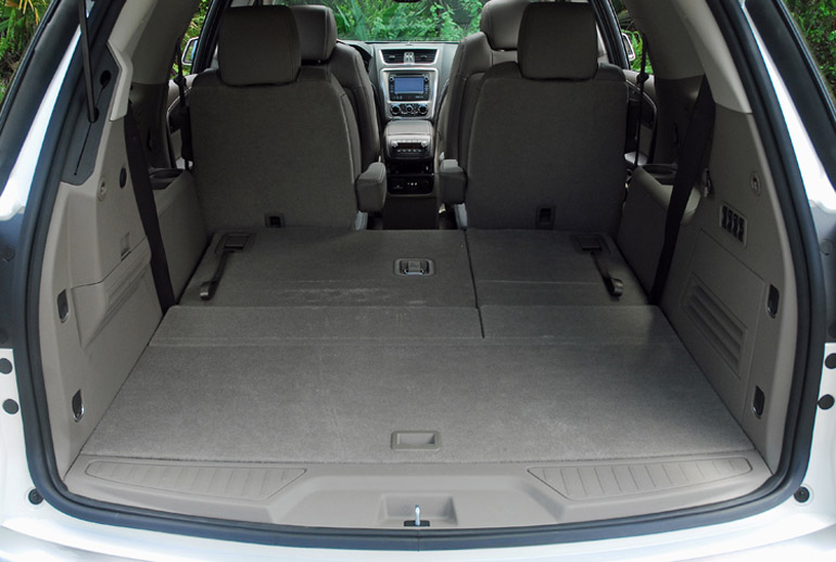 All Acadia models offer three rows of seating that can be configured for seven or eight passengers, regardless of the trim level. The seating configurations include two front bucket seats, a 60/40-split second-row bench or two-row captain’s chairs and a 60/40-split third row bench seat. GM’s exclusive Smart Slide feature is standard, allowing quick and easy access to the third-row seating area. The second-row seat cushion flips up while the seatback slides forward, effectively compressing the space occupied by the seat with the pull of a lever. The Smart Slide system also allows the second row to be positioned fore/aft. When adjusted rearward, the second-row seat provides more legroom for taller passengers. When adjusted forward, it provides more storage space or additional legroom for third-row passengers. Storage space of 24.1 cu.ft. is available behind the third-row seat. Maximum available storage capability behind the first row seats is 115.9 cu.ft. additional standard interior features inside includes tri-zone automatic climate control, rear-seat entertainment system with USB port, a rear DVD player with remote control, overhead display, a Bose 5.1 surround sound system with eleven speakers, two sets of wireless headphones, three-prong household-type power outlet, a head’s-up’ display that helps keep your eyes on the road, remote keyless entry, remote vehicle start, Navigation system, center console with dual cup holders, sliding armrest and deep storage bin, dual SkyScape two-panel sunroof and fixed rear glass, leather/wood/power tilt/telescopic/heated steering wheel with audio controls, roof-rack with aluminum side rails, trailer hitch, power windows/door locks with front express up/down, rear cargo storage system underfloor, universal home remote, cruise-control, dual map lights, dual lighted vanity mirrors, Denali signature floor mats and grab handles at each passenger door.