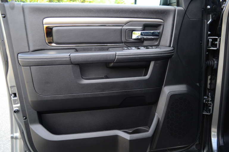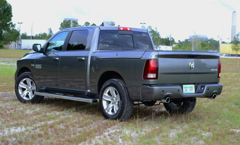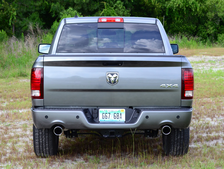 The efficiency model of the new Ram 1500 does not end with its powerful and efficient V8 engine, but being mated to a new 8-speed automatic transmission sets other fuel saving and performance advantages in motion. The 8-speed automatic transmission shifts smoothly yet is up to the job of transmitting power to the rear wheels or all four to tow just over 10,000 pounds at the push of a button. The 8-speed automatic has manual shifting buttons forward-facing on the steering wheel just above the cruise control buttons. With just a load of a few passengers you could expect to get as much as 25 mpg on the highway. During my excursions on the highway with just two passengers I was able to average 23.6 mpg on the highway at about 60 mph. Of course this figure dropped drastically after climbing above 70-75 mph. Around town I saw a low average of 14.9 mpg, which is a bit short of the EPA estimated 17 mpg city mark probably due to my enjoyment of the 407 ft-lbs. of torque jolting the Crew Cab forward from a dead stop.