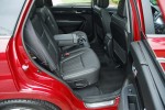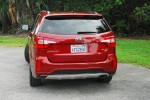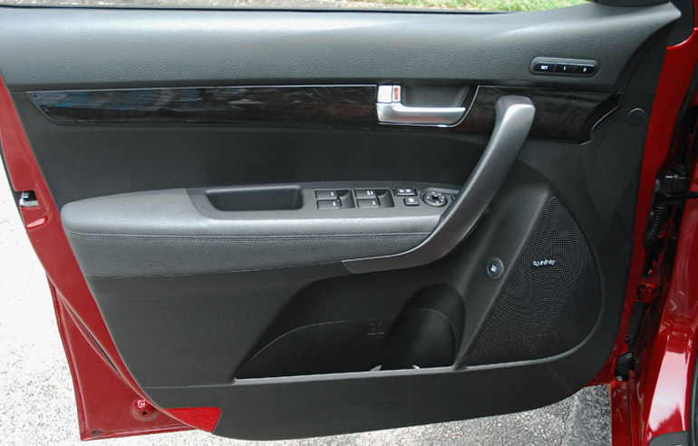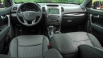 The exterior styling has been refined for a more dynamic and sophisticated look. Redesigned front and rear fascias enhance the Sorento’s road presence with a more substantial and round front bumper with a lower, broader appearance and a visually wider stance in the rear. The ubiquitous Kia tiger-nose grille is enhanced with an anodized silver metal mesh appearance and the lower valance has been opened to expose and aggressive cross-hatched opening. Front LED positioning lamps create dramatic eyebrows while new HID headlights peer from behind tapered clear lenses. The new foglamps on the SX have been upended and pushed to the far corners of the front bumper for better forward and side visibility. A front aluminum skid plate helps with airflow. Horizontally positioned rear LED combination lamps embrace the turn signal and back-up lamps, emitting a warm corona that makes the 2014 Sorento instantly recognizable from behind. A rear spoiler sits on top of the new programmable power liftgate. Down below is an aluminum diffuser and a wide exhaust tip on the right side. From the sideview you’ll see little space between the tires and the molded wheel-wells, steeply raked windshield A-pillars, pull-out door handles, aero-styled power-remote, power-folding, heated sideview mirrors, a chrome strip running along the bottom of the greenhouse and deep lower side extensions. The new refined look is taut and athletic, a welcome change from the bland designs of many mid-size CUVs.