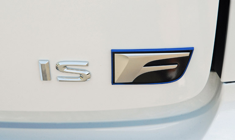 Management of the airflow for the engine and brake cooling can be seen in the large upper and lower mesh grilles, along with brake cooling ducts in the lower grille and air inlets in the front fenders. The new carbon fiber rear spoiler does its job of keeping the rear solidly planted on the pavement at high speeds. The standard cats-eye headlamp cluster features Bi-Xenon HID headlamps plus a lower string of LED daytime running lamps and the new HID foglamps down below. Flat underbody panels manage airflow thus enhancing stability at high-speeds. The silhouette shows the raised center section in the hood that clears the 5.0 liter V8, steeply raked windshield A-pillars, bodycolor power remote/self-dimming/puddle lamp/defogger sideview mirrors, bodycolor pullout door handles, buttoned up windows wrapped with a tasteful full-perimeter chrome strip and a short deck. The front fenders and rear hood lid shows the silver, black and blue F badge. The IS F cuts through the air with a very low 0.30 coefficient of drag.