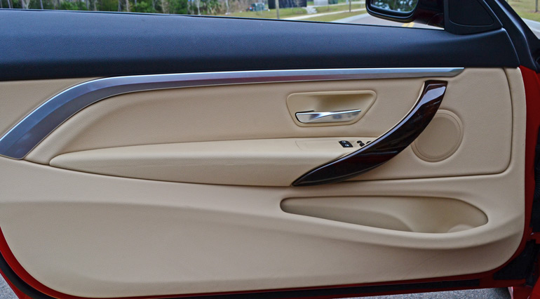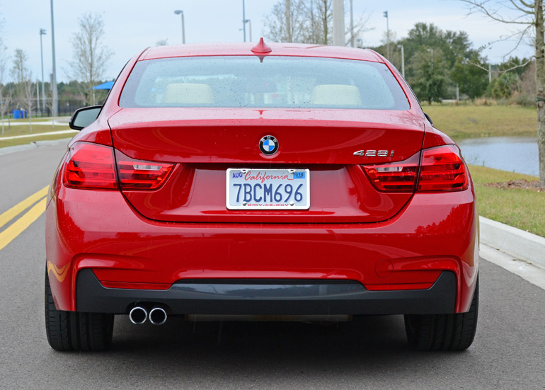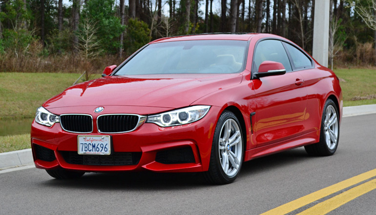 The new 2014 BMW 428i happily fulfills the placement of the go-to and benchmark luxury sports coupe, which has worn a variation of the 3 Series badge for about 4 decades now. Enthusiasts will delightfully praise how the 428i, and more-powerful 435i (300 horsepower 3.0-liter inline-6-cylinder), has carried the 3 Series coupe’s enthusiastic tradition with a steady forward momentum where it left off. This forward momentum is evident in the 428i M Sport package setting itself apart from the normal 428i with more aggressive aerodynamics (different front/rear bumper and diffuser), larger 18-inch staggered aluminum wheels wrapped in 225/45/R18’s up front and wider 255/40/R18 tires in back. The M Sport package also adds on adaptive M suspension (adaptive and adjustable dampers according to selectable ecopro-normal-sport-sport+ drive mode), sports seats, dark Burl walnut wood trim, M steering wheel, shadowline exterior trim (darkened trim), anthracite headliner, and a separate M Sport brakes add-on option featuring larger rotors all around, blue-painted 4-piston calipers up front and 2-piston rear. The Dynamic Handling Package added to my 428i M Sport test vehicle adds variable sport steering, basically dialing in the steering ratio for a perfect quick-steering balance and a nice weighted feel from the new electric-power-assisted steering rack. The adaptive dampers were very subtle in their variation from the selectable driver modes (eco pro, normal, sport, sport+) where the most noticeable change in the modes where found in the transmission’s shifting patterns, throttle position and steering wheel weightiness. In either mode the adaptive dampers provided a competent ride quality where Sport+ mode was better at keeping the 3,470 pounds in check around hard corners. Speaking of weight, the difference in the 6-speed manual transmission equipped 428i vs. my 8-speed automatic is only 50 pounds with the advantage being the lighter manual transmission.