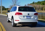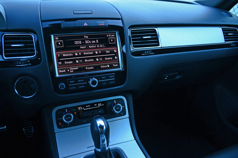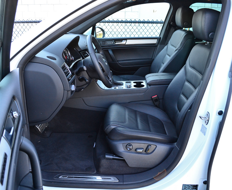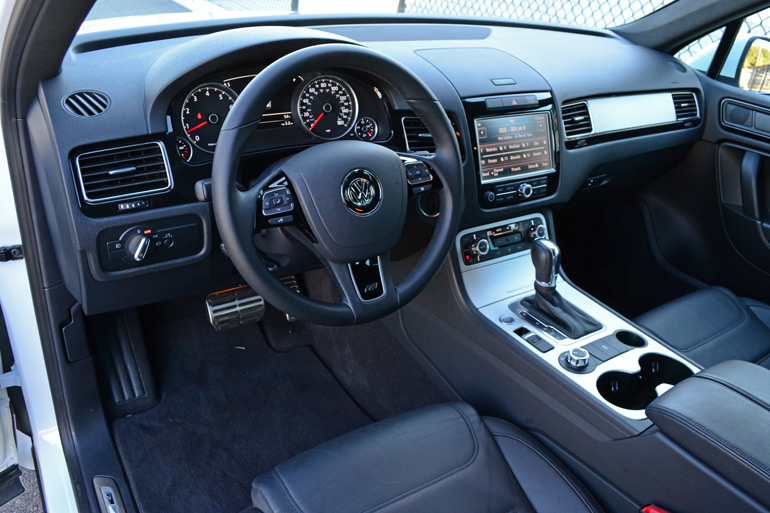 The 3.6-liter VR6 engine is nicely matched to a new 8-speed automatic transmission. Together the power delivery is adequate with a surprising initial surge through first gear to really move all 4,711 pounds of German engineering forward. Through all 8 forward gears the Touareg pulls nicely but not with the consistency of the extra grunt it exerts through first gear. Basically, after hitting 2nd gear the Touareg plays catch up to finish what little bit of the extra momentum was expended through the short 1st gear. Though, the Touareg does give you some confidence in overtaking vehicles on the highway and having the ability to tow up to 7,000 pounds is also an added plus. Another surprising aspect of the new 2014 Touareg R-Line is its sport suspension’s ability to keep the body roll to a minimum for an SUV of this stature. The size of the new 2014 Volkswagen Touareg is not realized until you sit in the cabin, which is highly competitive in over-all space among its direct competition exhibiting only 2 rows of seats. On the flip side of things, the Touareg R-Line’s competent road characteristics virtually shrink the SUV to emit a slight dash of nimbleness. A dedicated off-road mode takes the 4Motion full-time all-wheel-drive system to a new level through the adaptive Torsen center Limited-Slip differential. In normal on-road mode the power split is 40% front and 60% rear. Off-road mode will allow the split to vary dependent on where slip is detected to rout additional power to the wheels with grip. Additionally, off-road mode displays a dedicated steering angle meter on the dashboard. On the road-going prowl, the new 2014 Volkswagen Touareg V6 gets an EPA estimated 17 mpg city and 23 mpg highway. Though those are not impressive figures, I was able to better the highway mileage to get almost 24 mpg with an average of 23.7 mpg over a 25 mile local highway trip. Though, at interstate speeds the mpg average declines quickly to about 22 mpg traveling just above 70 mph. Around the city I saw a steady 17.2 mpg to match the EPA estimate.