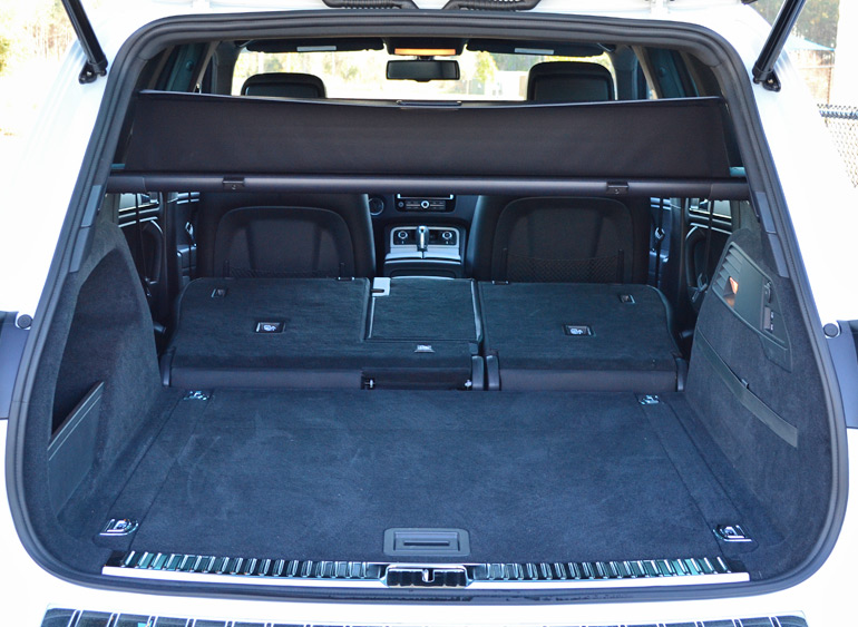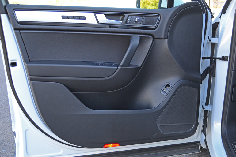 The unique Touareg R-Line is a mid-level trim where it adds onto the V6 Lux trim tacking on brushed aluminum interior trim, LED taillights, 20-inch alloy wheels, Sport suspension, unique R-Line badging and a sport body kit. Other highlighted feature subsets within the V6 Lux trim, all included on my V6 R-Line Touareg, include a rearview camera, touchscreen navigation system, power-liftgate (R-Line takes away the hands-free foot-activation liftgate option), keyless access with push-button start, Bi-Xenon HID headlights with adaptive front lighting (turns headlights in direction of steering wheel angle), 12-way power adjustable heated front Vienna leather seats, heated and power-folding outside mirrors and a massively large tilting-and-sliding panoramic sunroof encompassing almost 85% of the roof with a power sunshade.