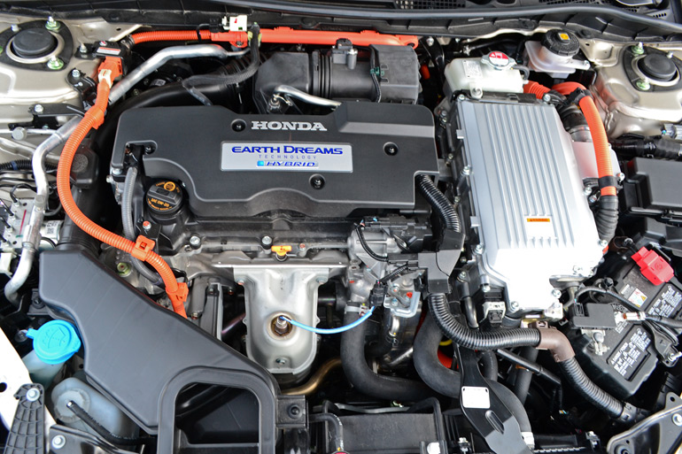 The all-new 2014 Honda Accord Hybrid joins the new Accord generation a year after the initial introduction of the redesigned 2013 Accord Sedan. Powering the new Accord Hybrid is a 2.0-liter 4-cylinder engine and two electric motors, one motor for acceleration and the other acting as a generator for recharging the battery during times like braking (enabling regenerative braking on-the-fly). The total power output from the engine and electric motor comes to 195 horsepower and 226 lb-ft of torque through a Continuously Variable Transmission (CVT) E-CVT, which is technically not a CVT (Continuously Variable Transmission) but a utilization of four gearsets and a clutch to power the front wheels. Together, the system is rather complex and technical but it comes off as working well to sync the gear sets for the electric motor and gas engine acting somewhat like a conventional CVT would. An interesting aspect is the gas engine does not directly power the front wheels until reaching about 40 mph. At that point the clutch system engages to connect the front wheels to the engine propulsion. Under 40 mph the 166-horsepower electric motor is fully responsible for propulsion by means of electric energy generated by the gas engine.