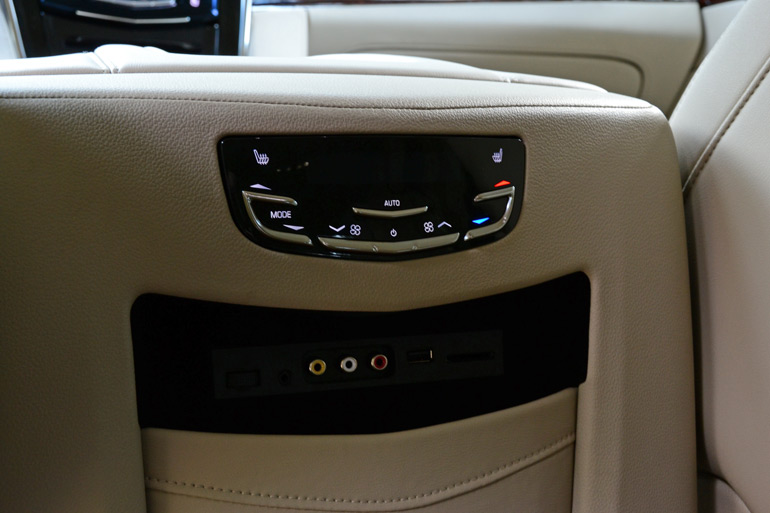 The cabin of the all-new 2015 Cadillac Escalade ESV is more of a short-stay vacation destination rather than the expected commonplace interior of a big SUV. There is really no shortage of space as all rows appoint virtually any size adult. The perforated leather seating up front, heated and ventilated, are comfortable for long trips and have just enough bolstering to keep you in place during light lateral movements. The 2nd row’s standard captain’s chairs give two passengers the feeling of authority, positioned in a spot to view the road or recline to watch a movie playing in one of the two roof-mounted Blu-ray player LCD screens. Out back, the 3rd row seating only diminishes leg room slightly compared to the 2nd row. As an option, the new Escalade ESV can be configured for 8-passenger seating by way of the 2nd row getting a bench seat in place of the two captain’s chairs.