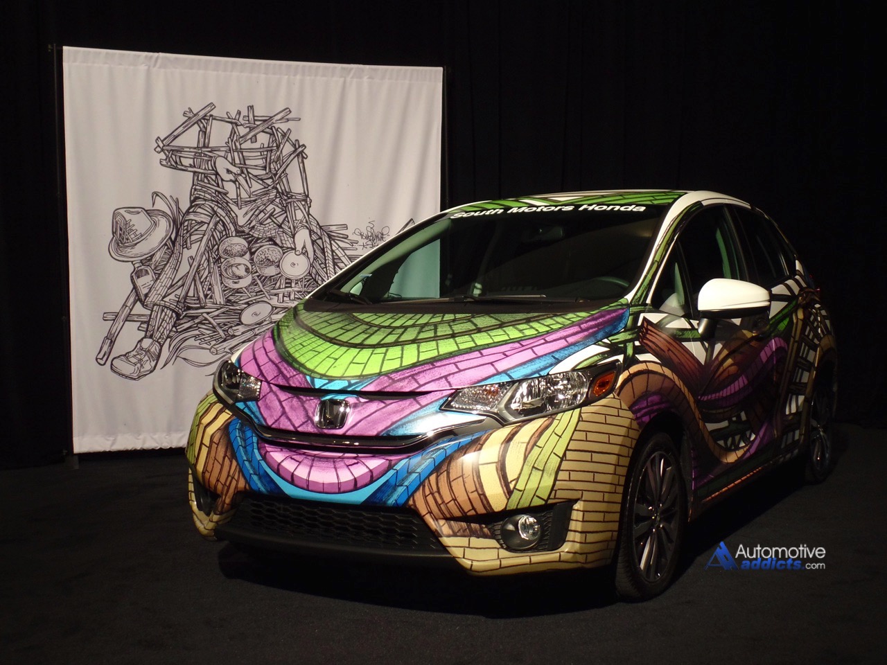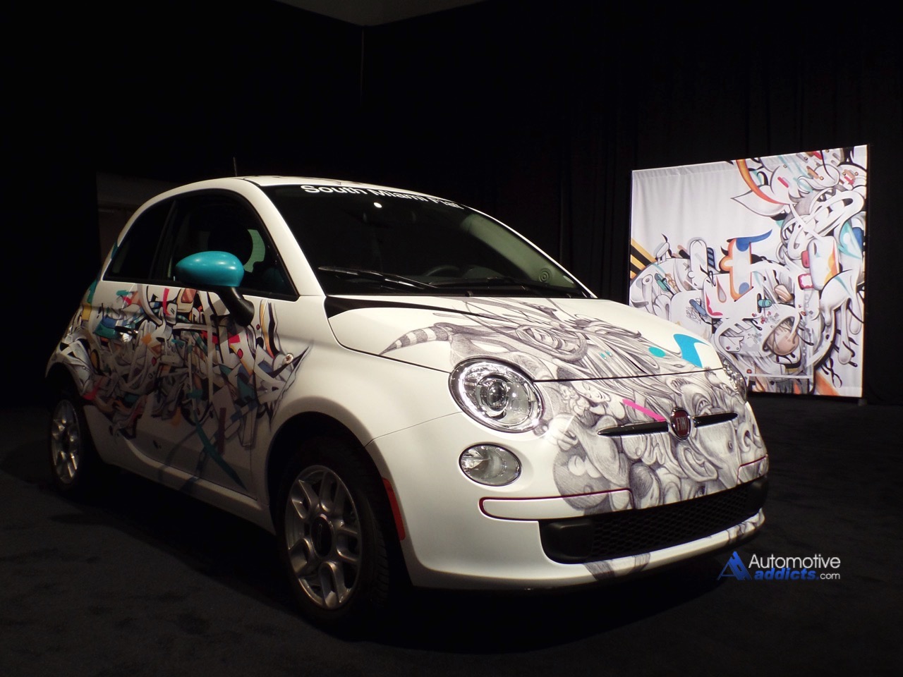 This weekend at the Miami International Auto Show, a group of celebrated world-reknown urban artists gathered together to decorate some of the newest vehicles available to consumers. And while the final product may not be everyone’s cup of tea for the casual run to the grocery store, the boldly decorated Fiat 500, over the top Honda Fit, attention grabbing Lamborghini Aventador, and dinosaur inspired Jeep Wrangler certainly are tasty.