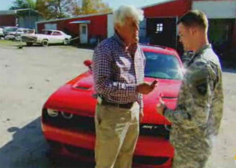 just being a down-to-earth guy. Extending his giving and heart-felt nature for others, Jay Leno surprises Cpl. Ethan Laberge with a new Dodge Challenger Hellcat.